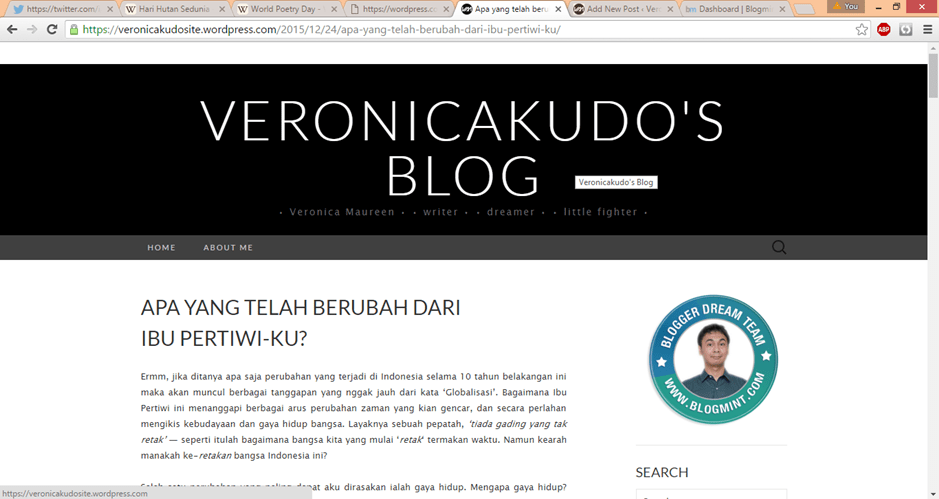 Kalo penasaran sama artikel yang aku buat, atau uda pernah baca dan mau baca lagi langsung aja klik : Apa yang Telah Berubah dari Ibu Pertiwi-ku?ย #BloggerDreamTeam.