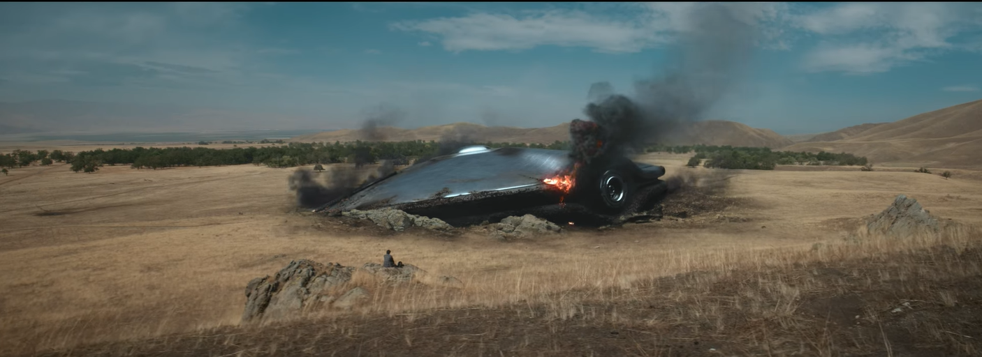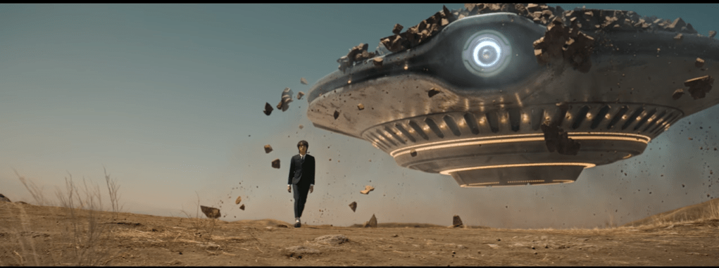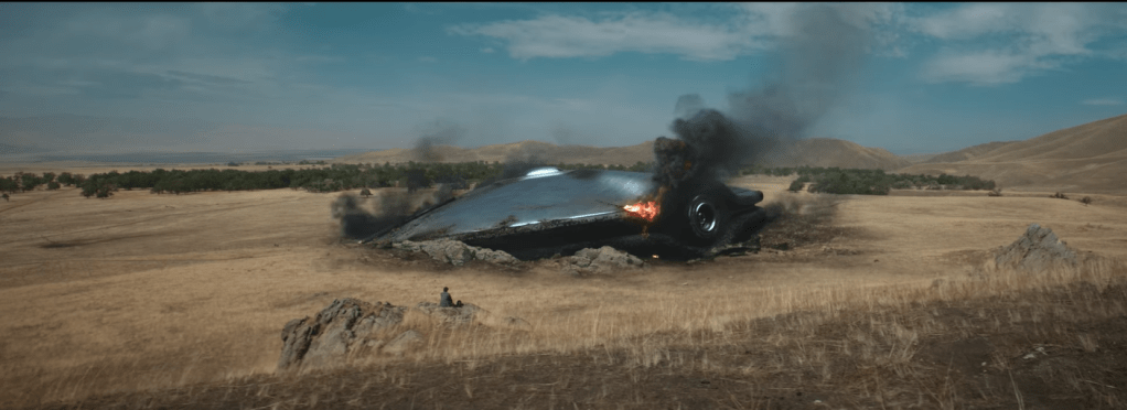 The scene starts with him staring at the UFO thing that looks broken because it crashed.