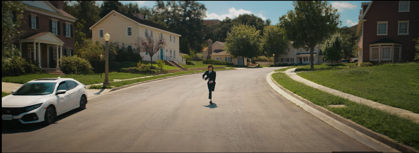 On the chorus, he’s all by himself, running. The road is still empty, but in the second verse, he’s going into the street with a lot of people, strangers.