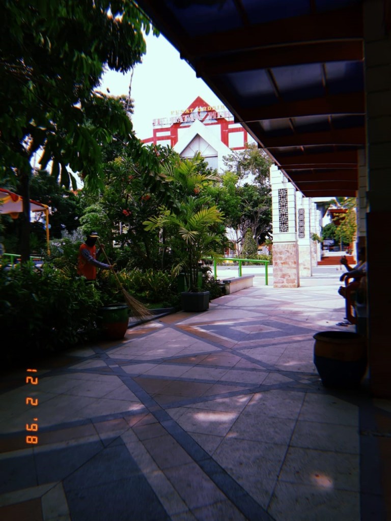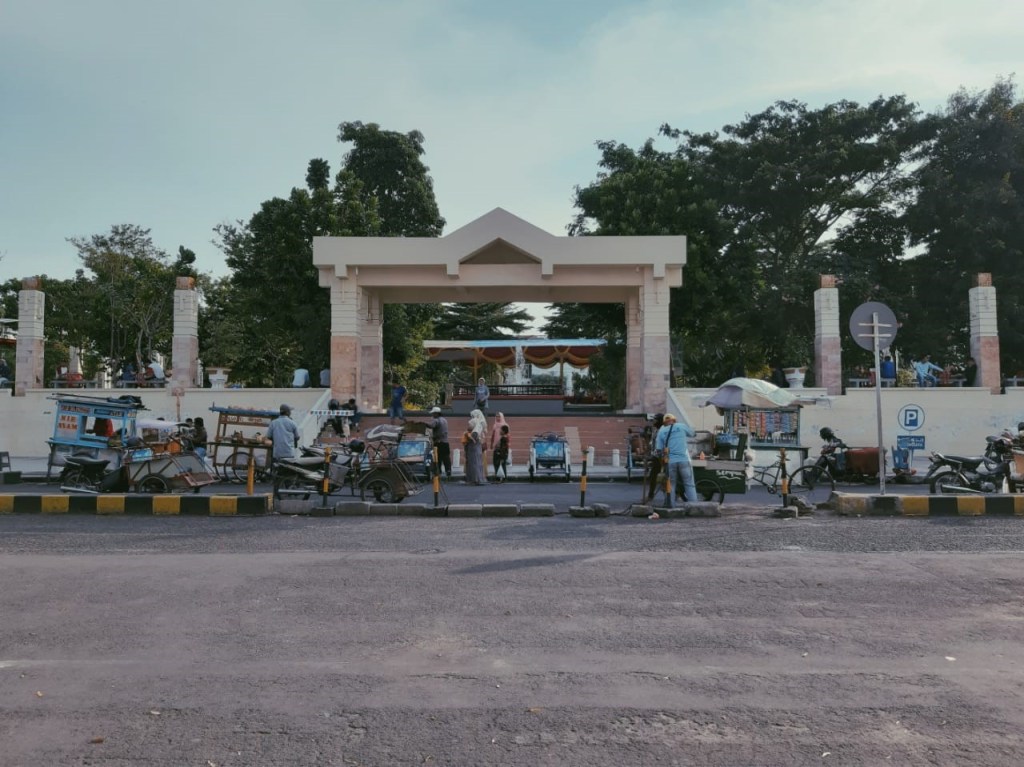 Melangkahkan kaki lebih dalam, di sepanjang trotoar juga ada beberapa pengunjung taman yang tengah bersantai duduk di kursi. Ada juga beberapa pengemudi angkutan umum yang tengah bersenda gurau satu sama lain. Pada bagian kiri trotoar, terpasang lampu-lampu yang membentuk lorong – yang saya rasa akan sangat menawan pada malam hari. Sedang, pada bagian kiri trotoar terpasang bambu-bambu dari bahan plastik bening yang berjajar sepanjang trotoar hingga akhir belokan jalan. Tak lupa, penanda bertuliskan “Taman Sejarah” berwarna merah dan putih yang telah saya sebutkan pada paragraf kedua tadi.
