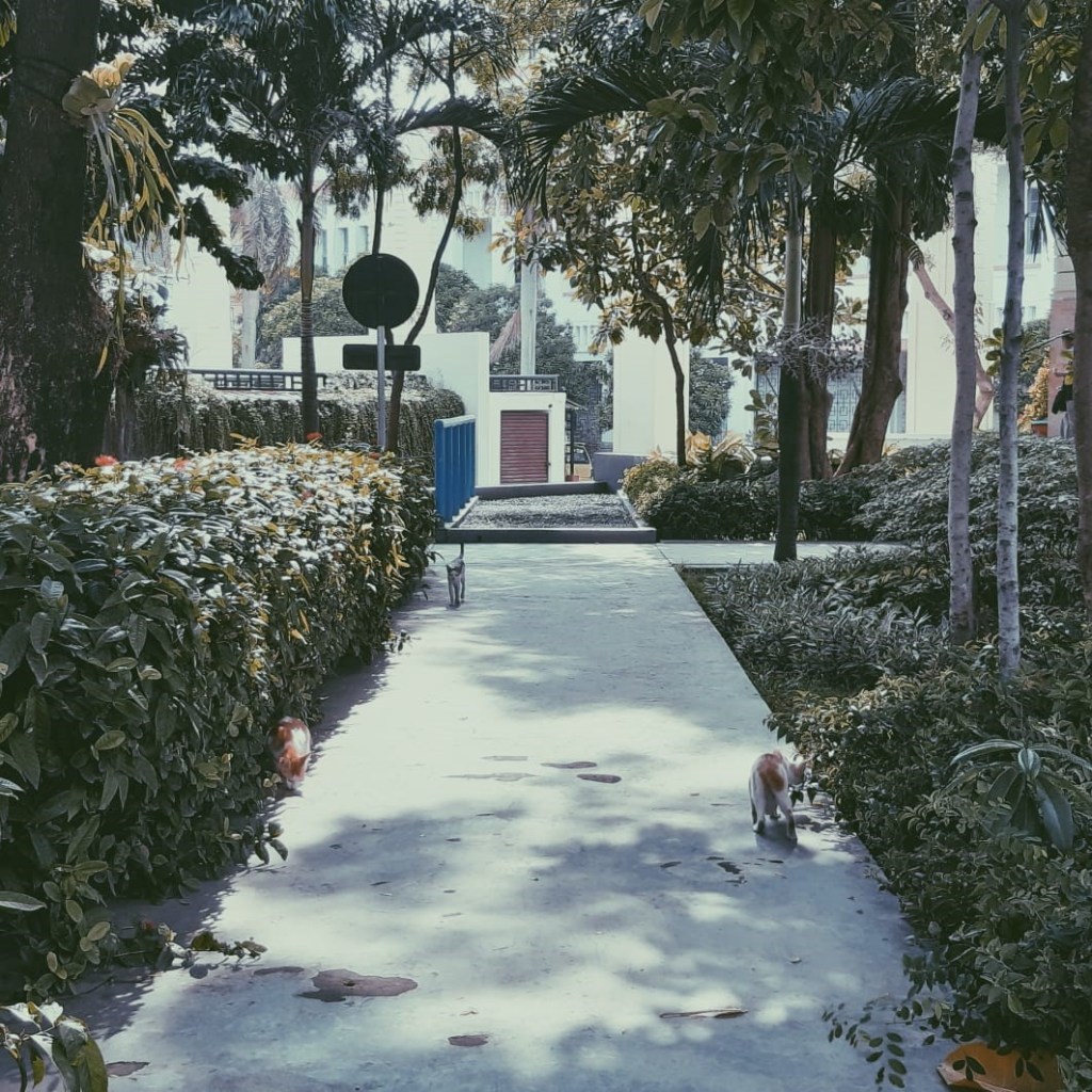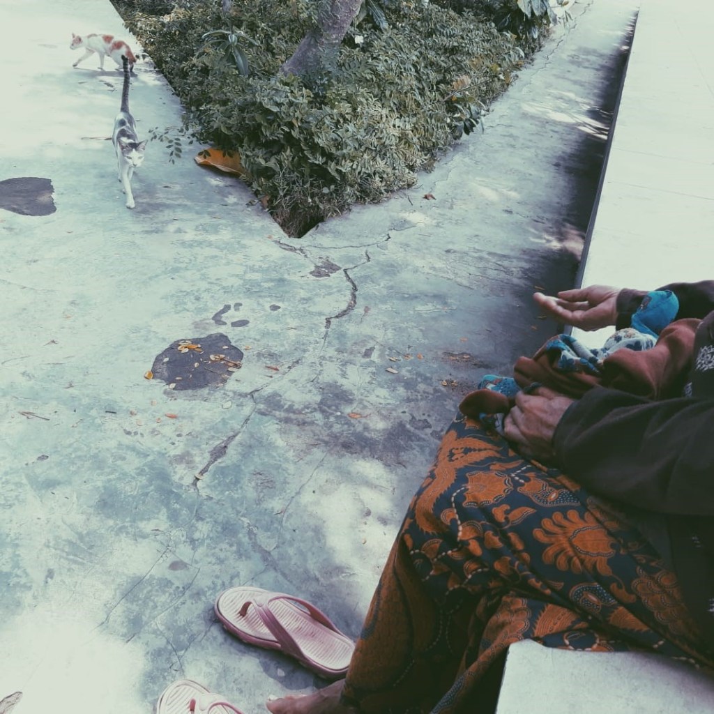 Mbah Emi memiliki kisahnya sendiri di taman seluas 5.300 meter persegi ini. Ketika saya sedang berbincang dengan pengunjung lain, saya melihat sosok Mbah Emi sedang membuka bungkusan kertas coklat dan membiarkan kucing-kucing yang lewat untuk makan. Bagi saya, yang sangat mudah tersentuh dengan kebaikan macam itu, jujur saja menjadi membagi perhatian antara perbincangan saya dan peristiwa yang menyentuh itu.