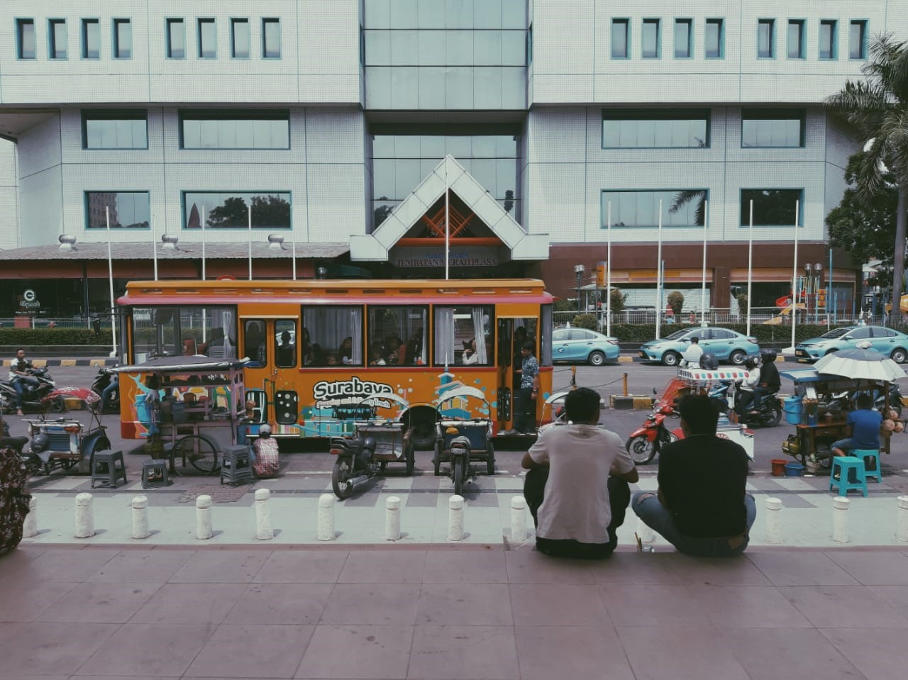 Pemandangan lain yang saya lihat ketika kunjungan saya ke Taman Sejarah ialah sebuah bus berwarna oranye menyala bertuliskan “Surabaya Shopping and Culinary Track” terparkir di ruas Jalan Garuda di sisi utara taman yang berbatasan dengan JMP.