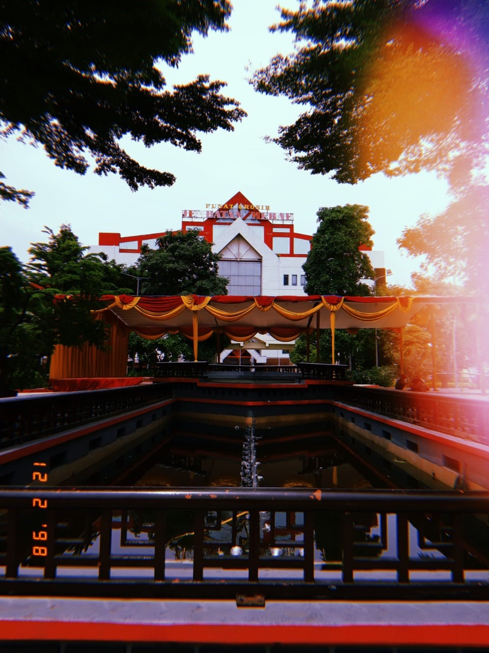 Sudah ada puluhan pengunjung di dalam area taman ketika saya melangkahkan kaki lebih jauh. Anak kecil berlarian ke sana kemari, beberapa yang lain duduk berteduh di bawah bayangan pohon, ada juga seorang ayah mengajarkan anaknya bermain pianika disalah satu bangku taman. Panggung berukuran 8 x 6 meter berwarna merah dan kuning lengkap dengan karpet merahnya terpasang di area plaza taman. Saya tidak tahu itu untuk apa, namun yang saya dengar dari Mbah Emi, terkadang ada penampilan tarian daerah pukul 3 sore.