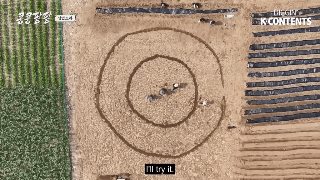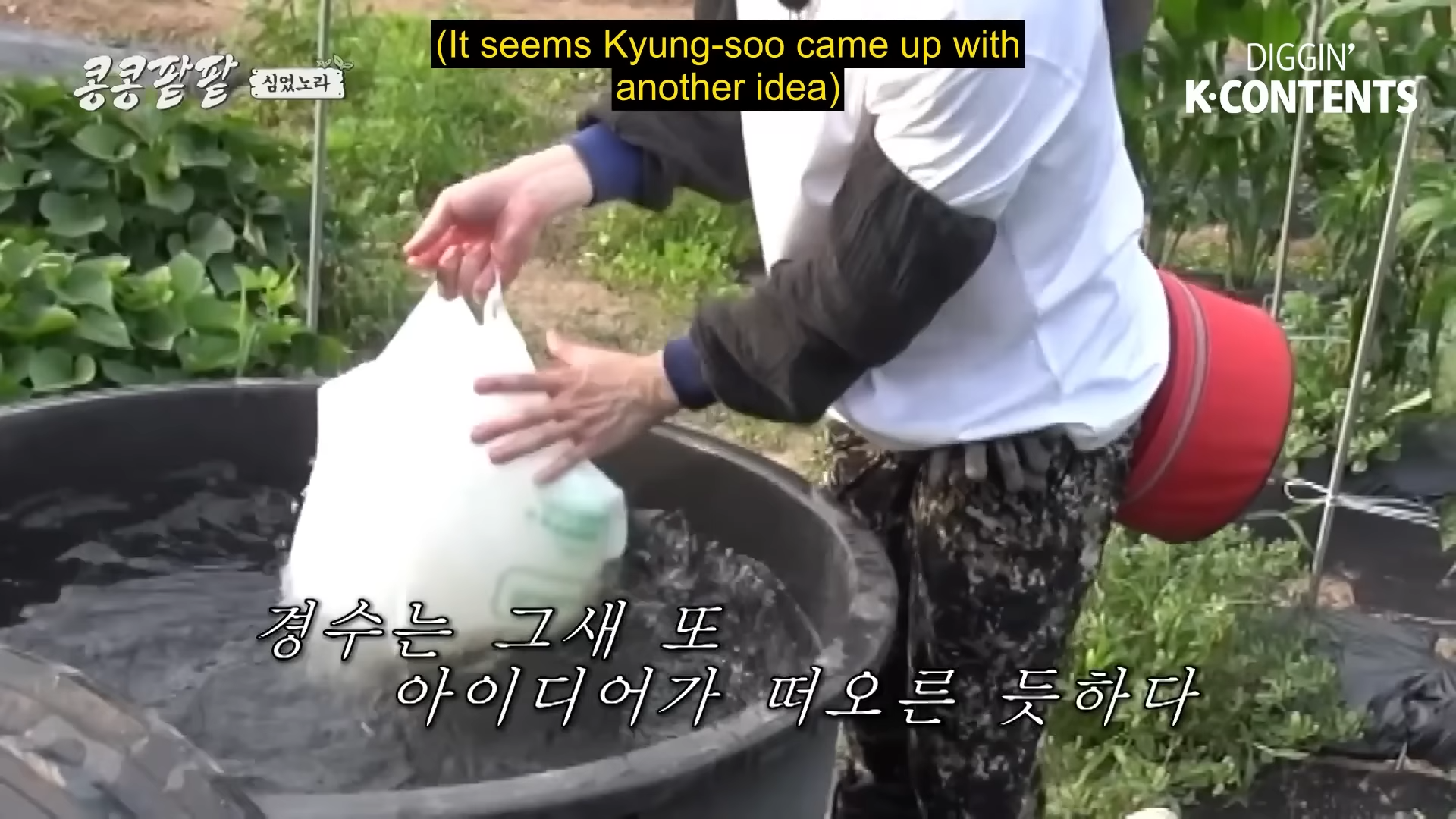 In general, I also love how Kyungsoo is giving big brain energy throughout the episodes with his ideas on the plastic mulch application, the watering DIY from the bottles and the plastic bag before they bought the watering jug.