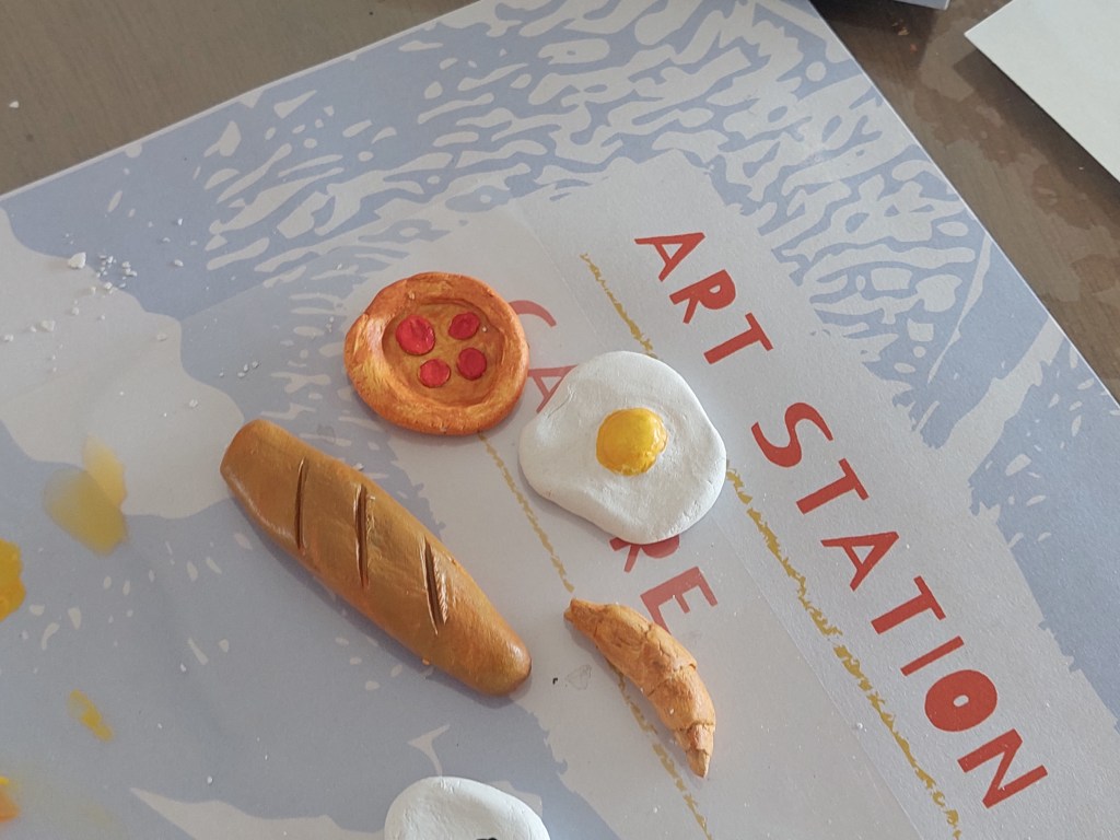 Foto di atas ini claynya sebelum dicat. Kinda look weird. Yang awalnya aku bikin sardines jadi merembet membuat food-related things. Pertama karena ternyata aku bikinnya kecil dan aku masih punya sisa claynya, kedua karena aku mikir makanan akan lebih mudah dibikin, I mean the baguette is so simplee and it looks good, right?! Lalu aku juga bikin photo stand karena lihat ada yang bentuk paw – I just couldn’t resist.